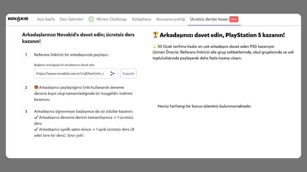 Platformun ruhunu tanımlayan şey ise şüphesiz oyunlaştırma. Karşıma çıkan ilk unsurlardan biri “Winter Challenge” oldu. Bu meydan okumada çocukların puan kazanmak için haftalık olarak en az 1 özel dersi tamamlaması, 5 oyun oynaması veya ödev yapması ve hatta bir arkadaşlarını platforma tavsiye etmesi gibi somut hedefler bulunuyor.