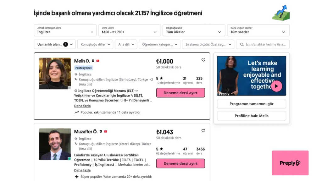 Preply → Sınav hazırlığı veya iş İngilizcesi gibi niş alanlarda uzman seçimi.