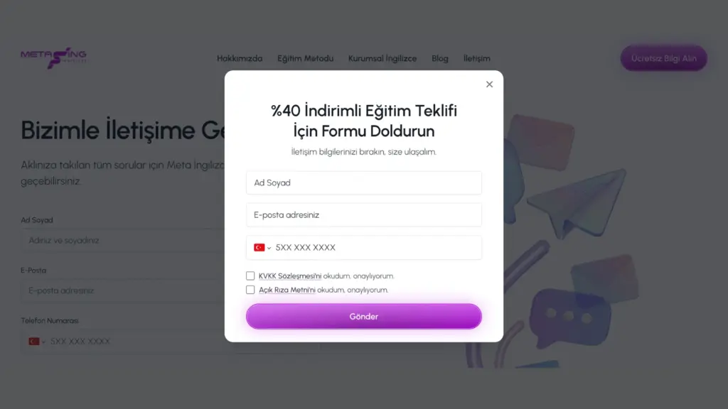 Meta İngilizce fiyatı klasik paket sayfası mantığıyla sunulmuyor. Kullanıcı önce iletişim sürecine alınıyor. Ardından demo webinar, bilgilendirme mesajları ve kampanya teklifleri geliyor.