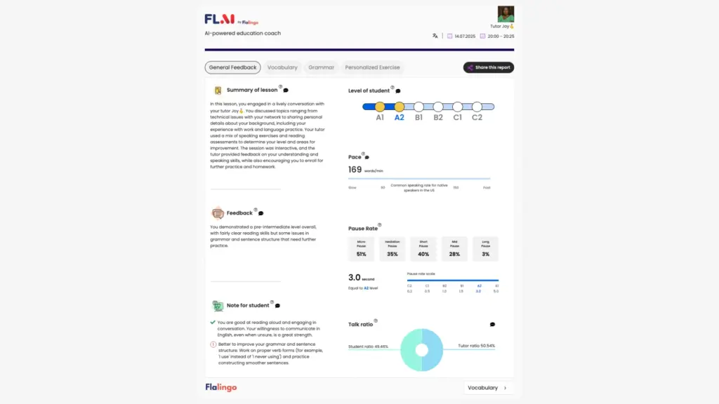 FLAI, Flalingo’nun yapay zeka destekli eğitim asistanıdır. Her ders sonunda, konuşma hızınız, derse katılımınız, güçlü ve zayıf yönleriniz gibi konularda size özel bir rapor sunar. Yaptığınız gramer hatalarını tespit eder ve doğrusunu gösterir. Yazımızdaki öğrenci deneyimlerine göre, özellikle eksik olunan konuları net bir şekilde görmek ve kişiselleştirilmiş pratik alanları belirlemek için oldukça faydalıdır.