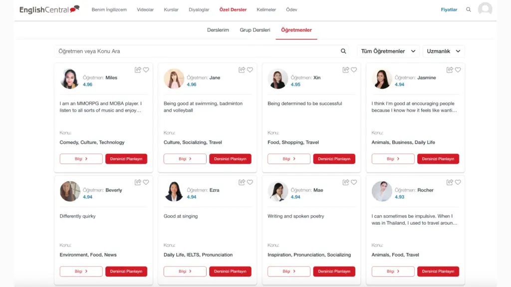 - Eğitim Modeli: Sistemin temeli 30.000’den fazla interaktif videoya dayanıyor. Videoları izler, kelime çalışır ve telaffuzunuzu yapay zekaya puanlatırsınız. Ardından haftada 3 gün, 25 dakikalık birebir derslerle öğrendiklerinizi pekiştirirsiniz. Favori öğretmenlerinizle maksimum 3 ders ileriye dönük planlama yapabilirsiniz.