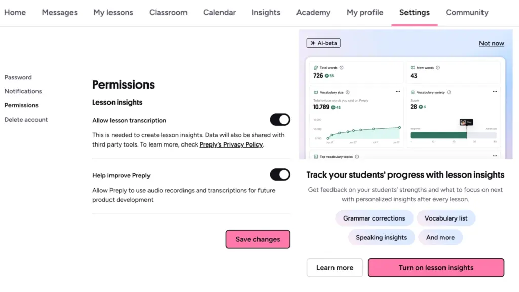 Preply’nin en yeni özelliklerinden biri “Ders Analizi” aracıdır. Öğrenci ve öğretmen ayarlardan bu izni verdiğinde sistem dersin ses kaydını deşifre eder (transkript) ve yapay zeka aracılığıyla kelime bilgisi, dil bilgisi hataları ve konuşma üzerine kişiselleştirilmiş bir rapor sunar.